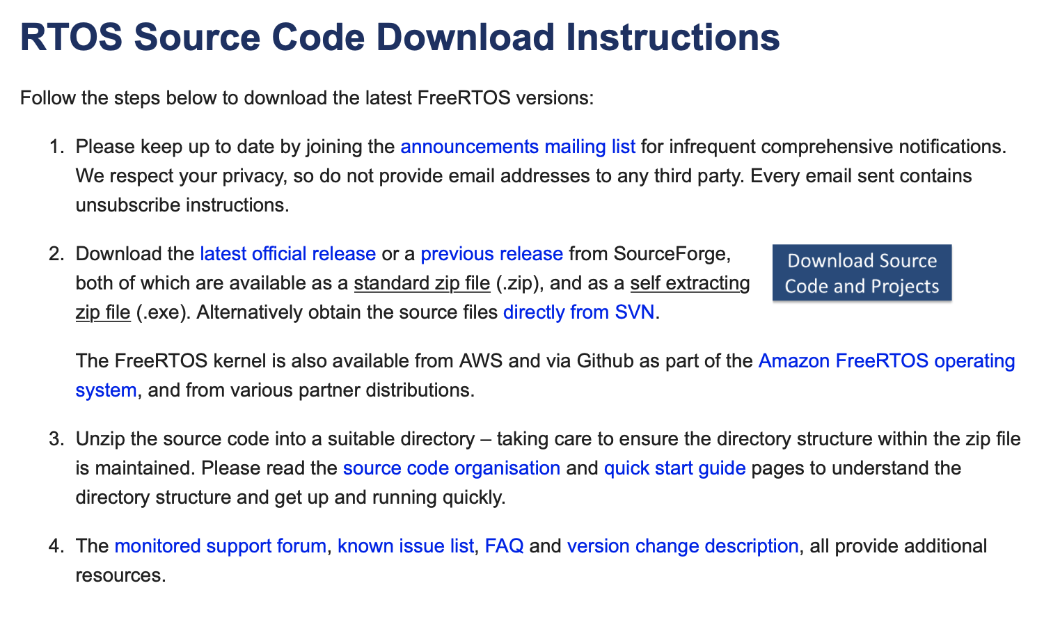 1. FreeRTOS 공식 웹사이트에서 다운로드 링크를 제공합니다. "Download Source Code and Projects"를 누르면 다운로드 페이지로 연결됩니다.