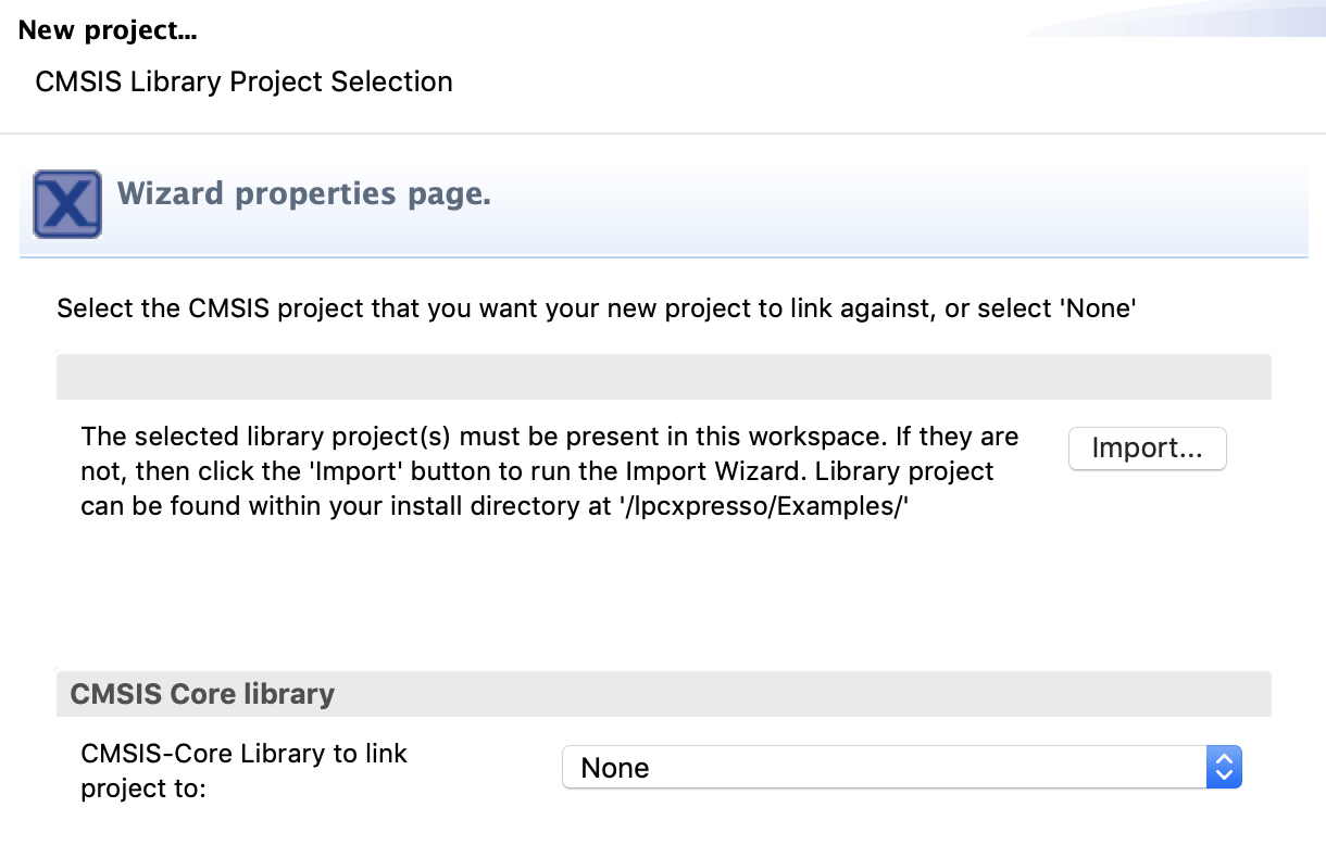 5. CMSIS 프로젝트를 지정해야 하는데 "CMSIS-Core Library to link project to" 부분에 None으로 아무것도 없다면 위쪽에 "Import"를 누릅니다.